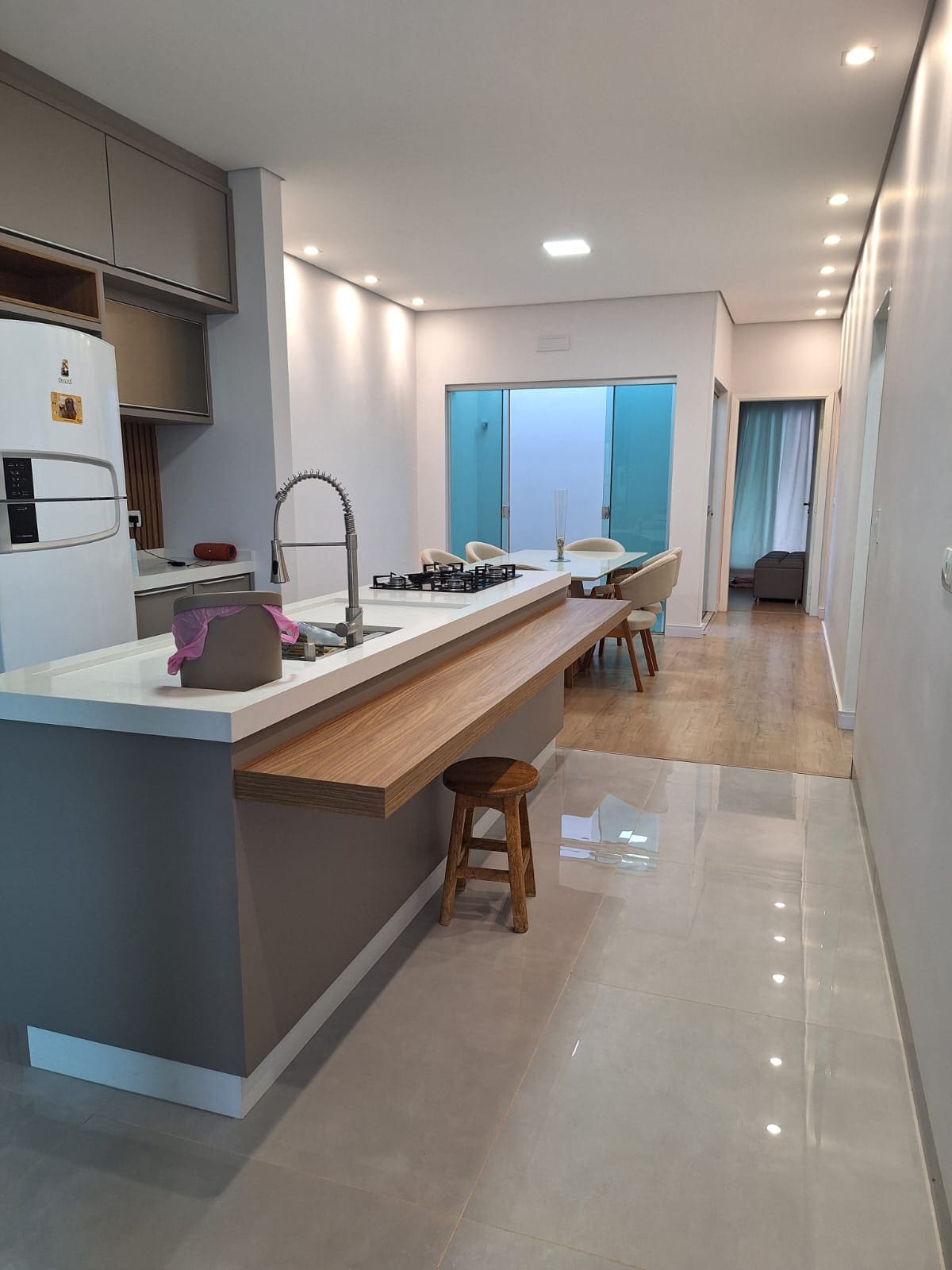 linda casa nova, com 3 quartos, 1 suite, sala alta, cozinha integrada, porcelanato, 3 banheiros, jardim de inverno, 2 garagens, quintal todo no gramado etc...