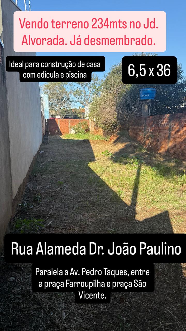 vendo terreno de 202 m², sendo 6,75 de frente por 30m de fundo, todo murado, proximo ao supermercado amigão do Alvorada.